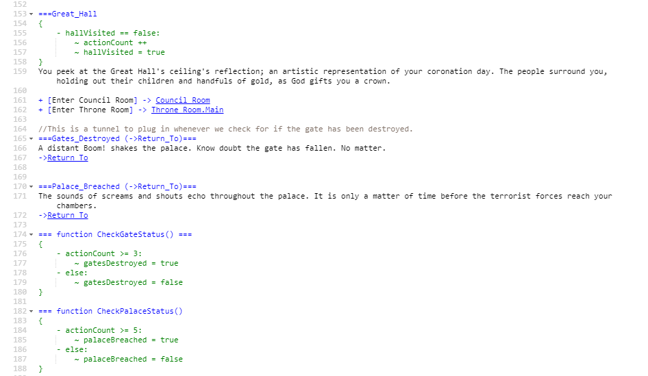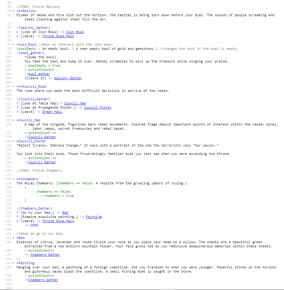 Utilizing variables that monitored where the player has/hasn’t been proved to be an essential resource. For starters, using an action count allowed me to create a sense of time flowing. After the player does x amount of actions, a tunnel is called regardless of where the player is that will display a paragraph telling how far the revolutionaries are from the player and therefore transitioning closer to the end of the game.