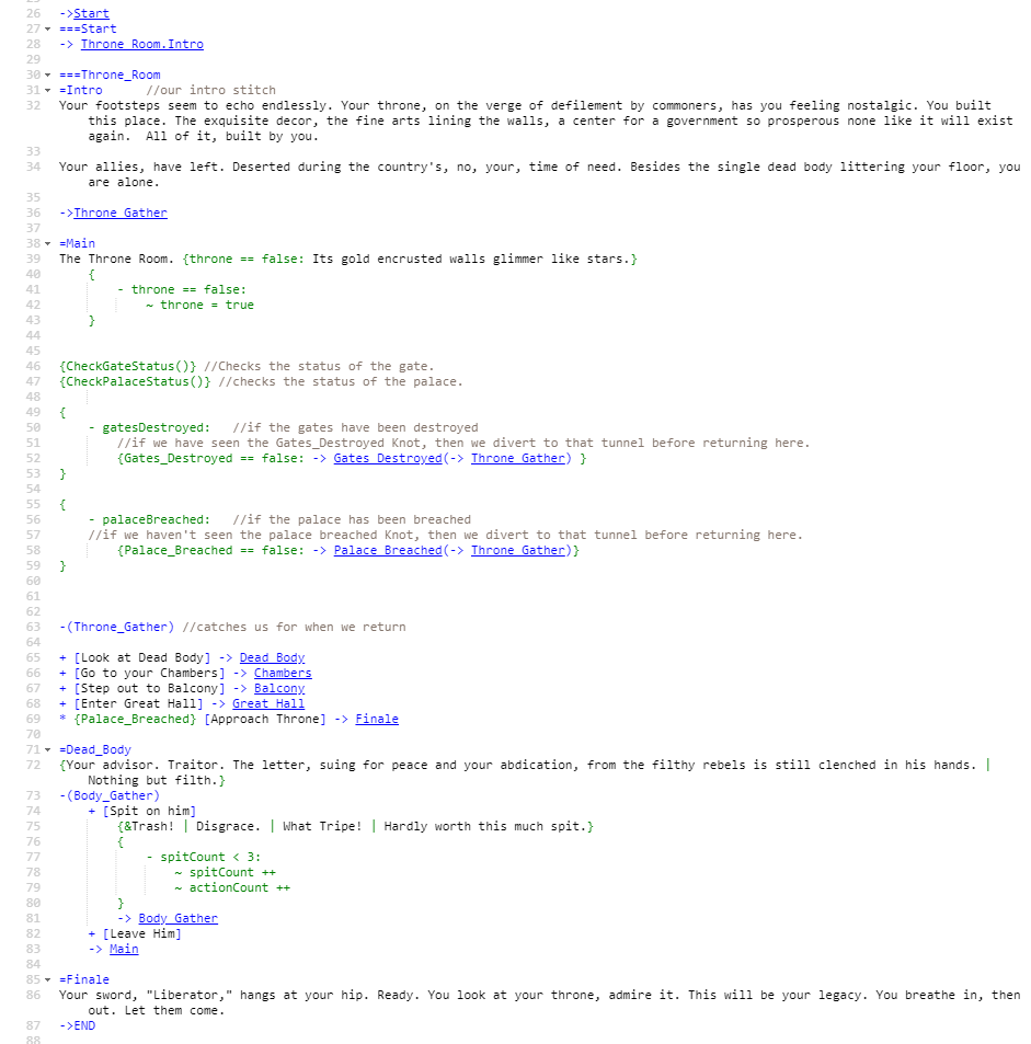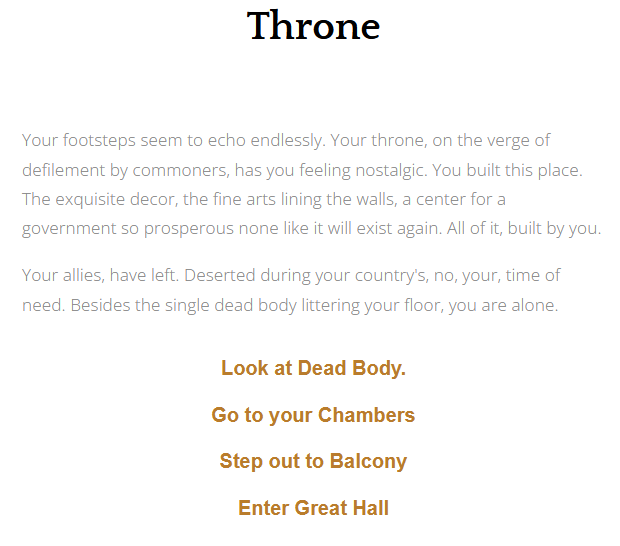 Working with such a strict word limit I couldn’t afford to have too many locales for the player to explore. But at the same time, I wanted to paint a picture of what this world and the King was like.